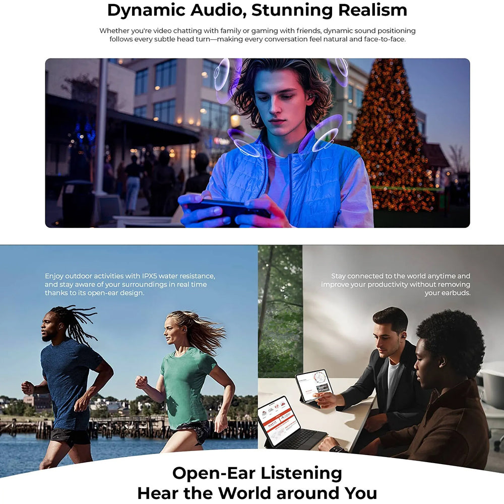• With a discreet open-ear design, the Bluetooth headphones remain comfortable all day long, without putting pressure on the ear canals.
