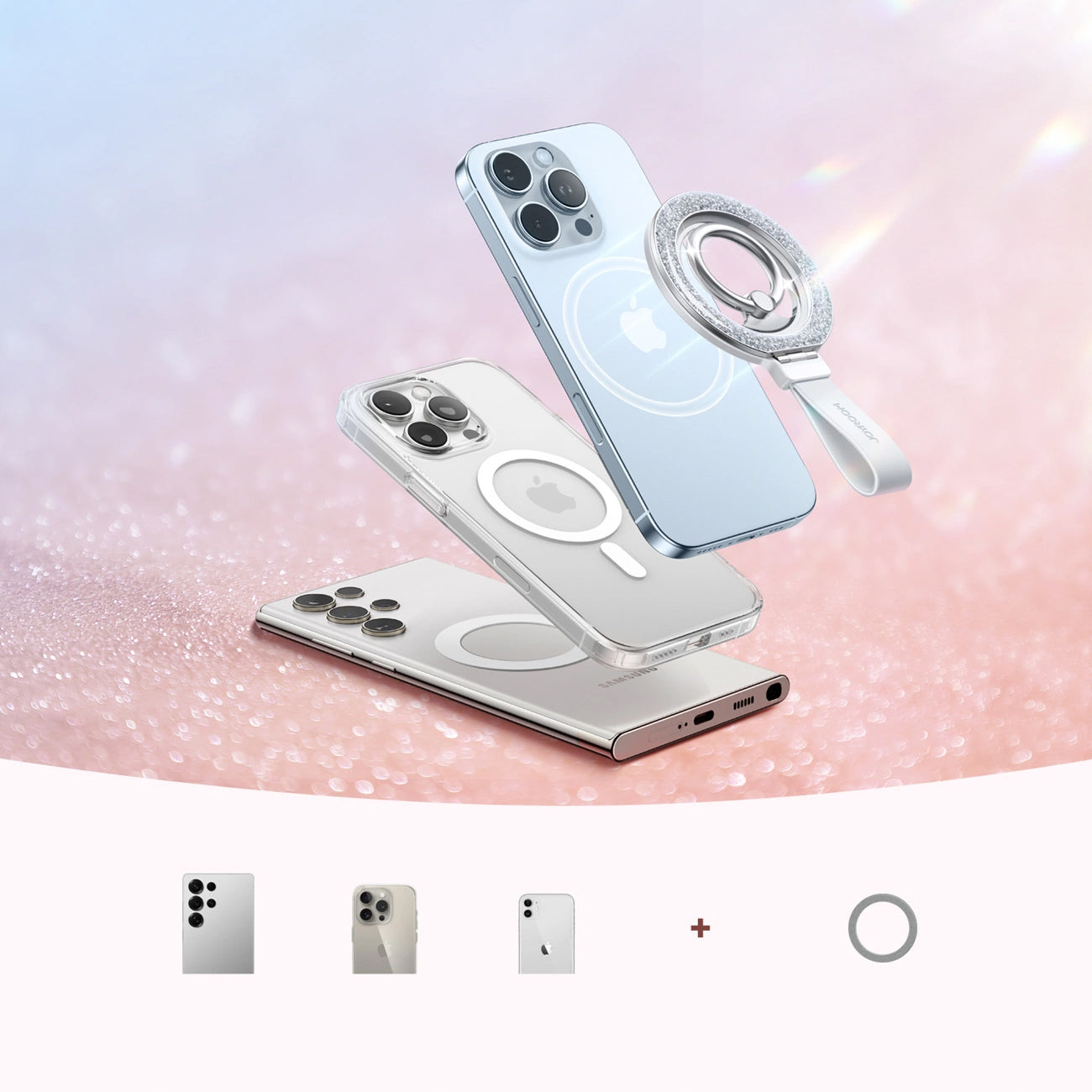 strong N56 magnets, the holder instantly attaches to MagSafe compatible phones and magnetic cases, and the included metal ring allows