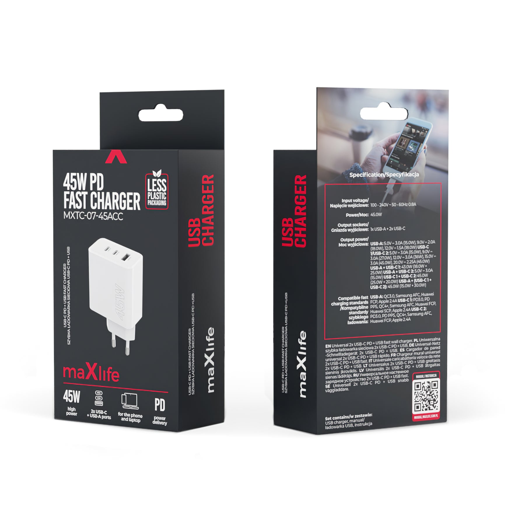 MaXlife Network Charger MXTC-07-45ACC, 45W, 3A, 1 x USB-A - 2 x USB-C, White