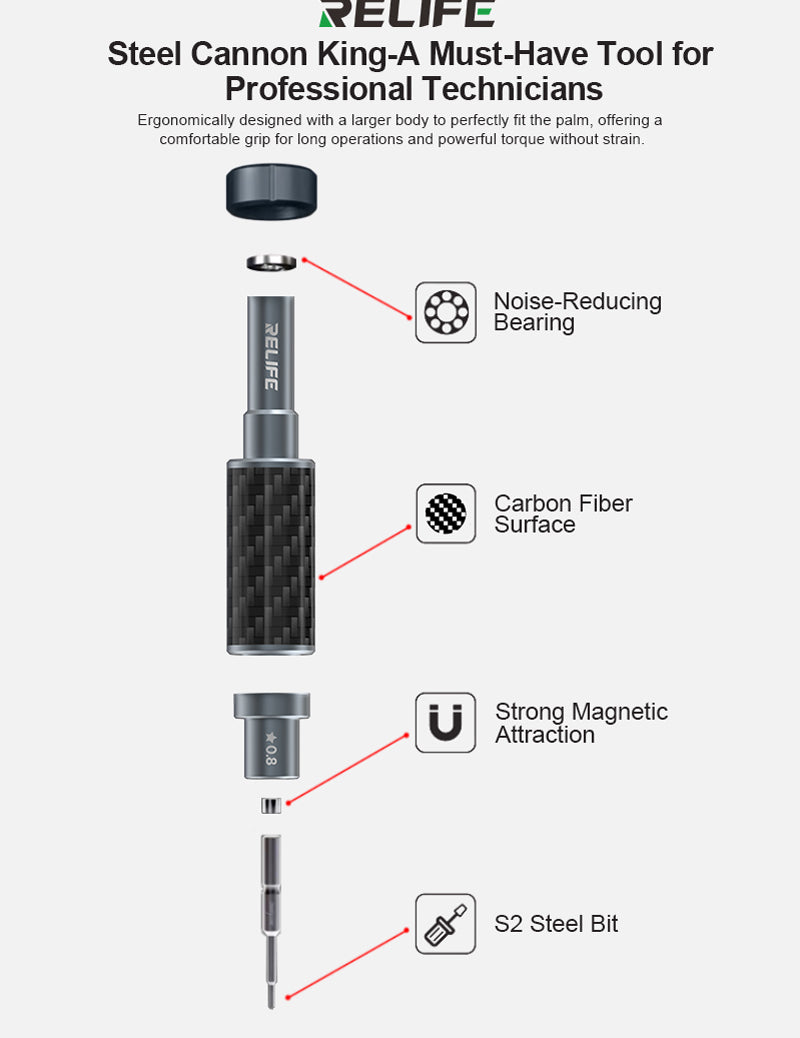 The Relife RL-729 screwdriver is ideal for unscrewing or assembling products.